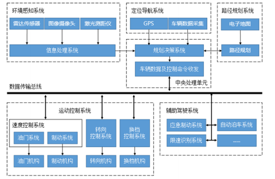 無人駕駛車輛是汽車智能化發(fā)展的最終方向,通過使用計算機、傳感器和其他技術設備使車輛在沒有駕駛員的主動控制和連續(xù)監(jiān)測下可以安全行駛。從整車制造角度出發(fā),無人駕駛車輛構造可分為環(huán)境感知系統(tǒng)、定位導航系統(tǒng)、路徑規(guī)劃系統(tǒng)、中央處理單元、輔助駕駛系統(tǒng)與運動控制系統(tǒng)六大系統(tǒng)。