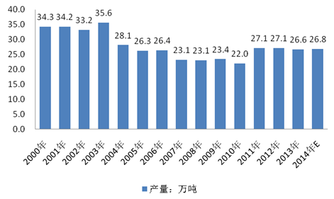 核心提示:2000年全球木棉種子產量為34.3萬噸,2013年下降至26.6萬噸,2014年產量為26.8萬噸。2000-2014年全球木棉種子產量:萬噸數據來源:FAO亞洲是全球木棉種子主要產區,亞洲產量為總產量的100%。2000-20142000年全球木棉種子產量為34.3萬噸,2013年下降至26.6萬噸,2014年產量為26.8萬噸。