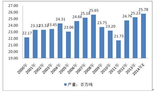 2000-2014年全球高粱(畜牧料)產量:百萬噸