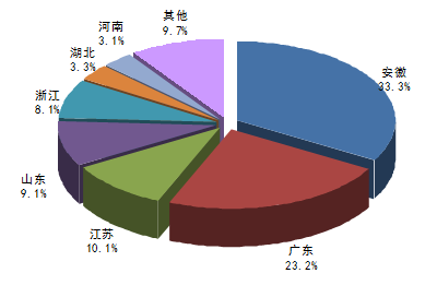 核心提示:中國產業發展研究網發布的《2016-2022年中國低溫制冷設備市場專項調研及未來前景預測報告》指出:2015年1-9月我國安徽省冰箱產量為2376.60萬臺,占同期國內總產量的33.3%;廣東省冰箱產量為1660.48萬臺,占同期國內總產量中國產業發展研究網發布的《2016-2022年中國低溫制冷設備市場專項調研及未來前景預測報告》指出:2015年1-9月我國安徽省冰箱產量為2376.60萬臺,占同期國內總產量的33.3%;廣東省冰箱產量為1660.48萬臺,占同期國內總產量的23.2%;江蘇省冰箱產量為721.78萬臺,占同期國內總產量的10.1%;山東省冰箱產量為652.62萬臺,占同期國內總產量的9.1%。