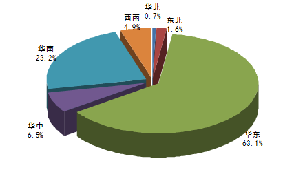 2015年1-9月我國華北地區冰箱產量為46.84萬臺,占同期國內總產量的0.7%;華中地區冰箱產量為465.59萬臺,占同期國內總產量的6.5%;西南地區冰箱產量為350.18萬臺,占同期國內總產量的4.9%;華南地區冰箱產量為1660.47萬臺,占同期國內總產量的23.2%;;華東地區冰箱產量為4506.17萬臺,占同期國內總產量的63.1%。