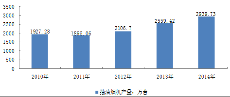 我國抽油煙機產量從2010年的1927.28萬臺增長至2014年的2939.73萬臺。2013年其增幅一度達到21.5%,為近幾年最高,而在2014年其產量增速放緩,相比2013年同比增長14.9%,預計2015年我國抽油煙機產量仍將突破新高,但市場可能會出現較為平緩的增速期。