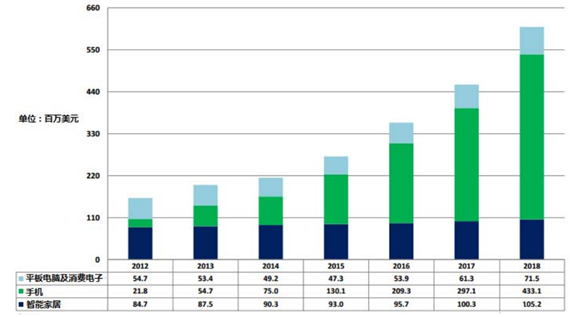數據顯示,2014 年 MEMS 壓力傳感器消費品市場規模為 2.14 億美元,預計到 2018 年消費類產品用MEMS壓力傳感器使用量將達到16.6億個, 市場銷售額為6.1億美元,從 2012 年到 2018 年復合增長率為 25%。其中,以手機和平板電腦為代表的消費類電子產品成為帶動市場發展的重要力量, 預計 2018 年在 MEMS 壓力傳感器產品應用中,手機應用市場規模將達到 4.33 億美元,平板電腦等其他消費類產品應用市場規模將達到 7,150 萬美元,智能家居應用市場規模將達到 1.05 億美元。