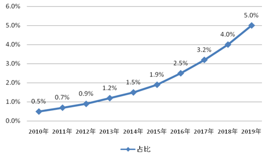 2010-2019 年無線傳感器在工業傳感器中的占比與預測