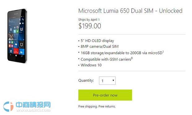 微軟Win10新機(jī)Lumia650美版開(kāi)啟預(yù)定:4月1日正式發(fā)貨