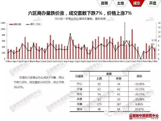 上周長沙市內六區商業辦公成交374套,環比下跌7.20%,成交面積3.65萬方,環比下跌36.63%。