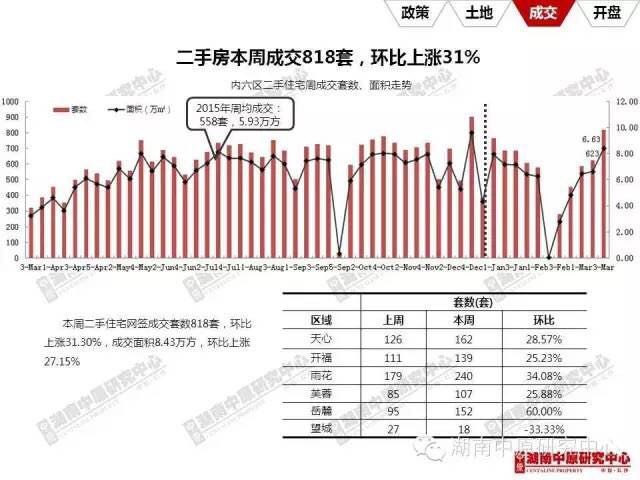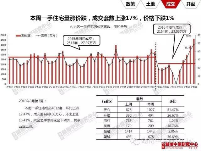根據湖南中原研究中心數據顯示:上周長沙新房成交量達4612套,環比上漲17.47%,成交面積48.30萬方,環比上漲15.41%。長沙樓市住宅成交已連續5周上漲,尤其進入三月份,三周總成交達11515套,已超過2015年月平均成交套數。