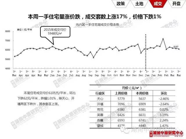 與此同時,上周新房成交均價6105元/平米,環比下跌62元/平米,跌幅1.01%。除天心、開福兩區下跌外,其余各區均上漲。