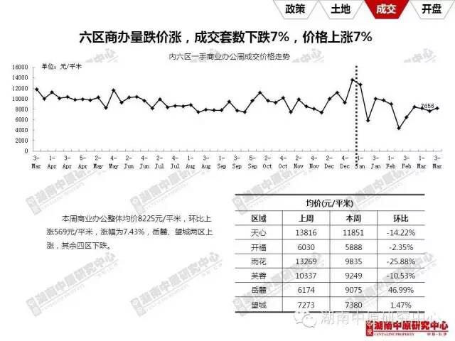 與此同時,商業辦公整體均價8225元/平米,漲幅為7.43%,岳麓、望城兩區上漲,其余四區下跌。