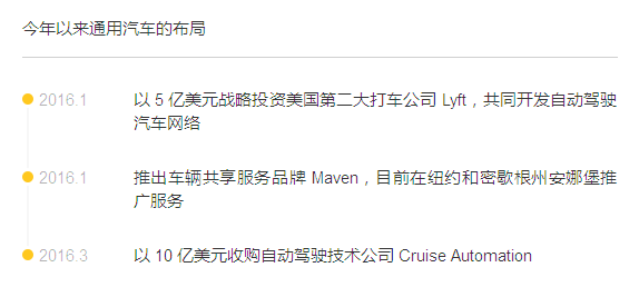 當然,這些跟車聯(lián)網(wǎng)、自動駕駛、汽車共享相關的技術也是各大汽車公司都在加緊布局的。相比“汽車制造公司”,現(xiàn)在大家都喜歡稱自己是“提供出行解決方案”的公司。通用汽車在這一領域也是動作頻頻。