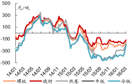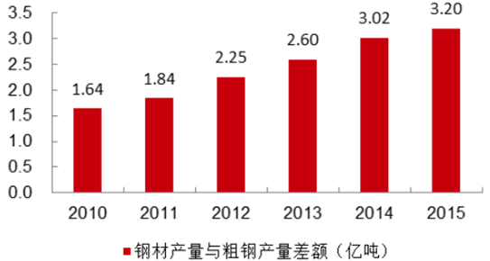 2015 年,我國鋼材產量(含重復材)產量達到 11.23 億噸,而同期粗鋼產量僅為 8.04 億噸,我國粗國目前的成材率大概為 97%到 98%,則鋼材產量(不含重復材)應為 7.8~7.9 億噸區間。目前鋼材產量(含重復材)遠高于粗鋼產量一方面是因為鋼材連鑄等環節造成的重復統計,另外一方面是地條鋼的大量存在,地條鋼多以螺紋鋼、線材等形式存在。