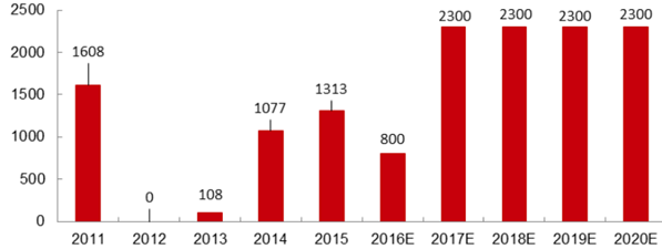 據工信部數據顯示: 2011 年到 2014 年河北省分別淘汰煉鐵產能 936 萬噸、 115 萬噸、 130 萬噸、 1378.5 萬噸,累計淘汰煉鐵產能 2559.5 萬噸;分別淘汰煉鋼產能 1608 萬噸、 0 萬噸、108 萬噸、 1077 萬噸,累計淘汰煉鋼產能 2793 萬噸。“十二五” 期間河北省累計壓減煉鐵產能 3391 萬噸、煉鋼 4106 萬噸,據此推算 2015 年河北省壓減煉鐵產能 831.5 萬噸、煉鋼產能 1313 萬噸。 而 2015 年全國淘汰煉鐵產能 1300 萬噸、煉鋼產能 1700 萬噸,意味著2015 年壓減產能的 70%都發生在河北省。 2016 年河北省將壓減煉鐵產能 1000 萬噸、煉鋼產能 800 萬噸,以上意味著 2017 到 2020 年將淘汰產能 9200 萬噸,每年淘汰 2300 萬噸。