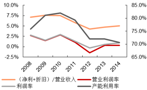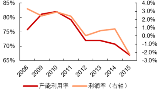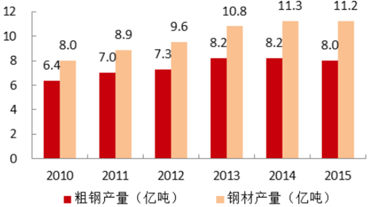 2014 年國內粗鋼產量 8.23 億噸左右,表觀消費量約為 7.39 億噸; 2015 年國內粗鋼產量 8.04 億噸,表觀消費量為 6.98 億噸,粗鋼表觀消費量同比下降 4040 萬噸。 預計未來國內粗鋼表觀消費量在 6~7 億噸區間,加上考慮近兩年出口的 0.8~1 億噸變動范圍,則國內的鋼鐵產量需要在 6.8~8 億噸。