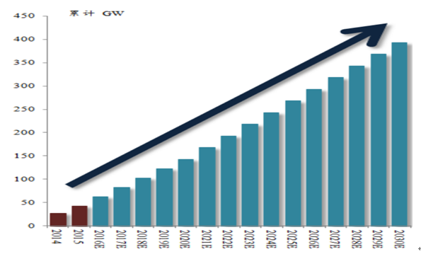 根據國務院下發的《能源發展戰略行動計劃(2014-2020年)》顯示,到2020年,非化石能源占一次能源消費比重達到15%。“十三五”光伏裝機目標初定為150GW,那么, “十三五”期間每年需新增約20GW左右的光伏裝機才可實現該目標。 值得一提的是,目前國家的政策傾向于分布式光伏,到2020年分布式光伏裝機要達到70GW,具有10倍增長空間,年復合增長率高達50%以上。根據中國光伏業協會預計,到2030年光伏裝機目標在400GW, 這意味著2021年至2030年年均新增25GW以上的規模。2015年是光伏裝機規模化元年,光伏行業將進入裝機規模化“ 新常態”。