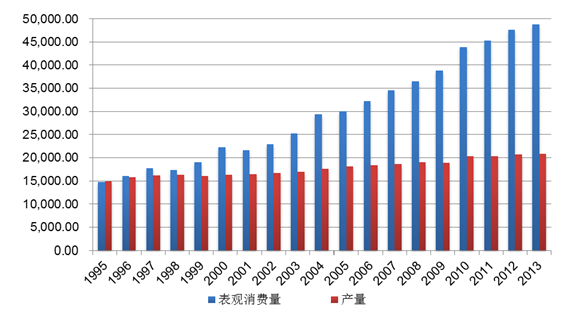 1995-2013年中國原油產量和表觀消費量變化趨勢