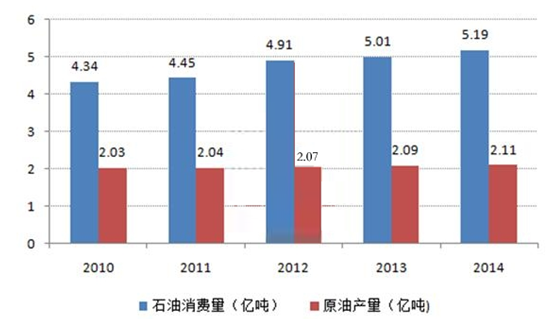 2010-2014年我國原有產量及石油消費量(單位:億噸)