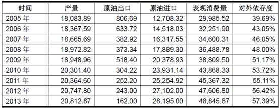 2005年-2013年我國原油出口、進口及對外依存度情況