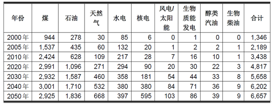 根據中國近年來能源實際消費情況,《中國2050年低碳情景和低碳發展之路》預測在基準情景下,我國中長期一次能源需求將快速增加。到2050年,我國一次能源需求量將增加到66.57億噸標準煤。其中,煤炭占44%,石油占28%,天然氣占10 %,核電占9%,水力發電占6%,風電、生物質能發電等新能源和可再生能源占3.4%。這意味著,至21世紀中葉前,我國一次能源消費仍以化石能源為主。
