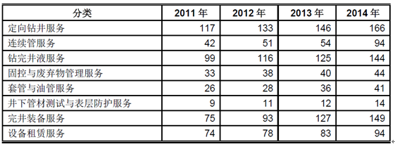海外鉆井相關服務隨著鉆井數量增加,裝備、服務和耗材價格上升,2012年-2014年市場規模保持增長。