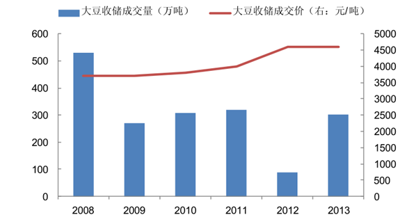 核心提示:2008 年金融危機后,為了保護農民收入,我國開始對黑龍江、吉林、遼寧和內蒙古實行大豆臨時收儲政策。 2008-2013 年實施大豆收儲制度的 6 年間, 國儲累計收儲量達 1817 萬噸。2014 年,我國停止大豆收儲政策,對東北和內蒙古2008 年金融危機后,為了保護農民收入,我國開始對黑龍江、吉林、遼寧和內蒙古實行大豆臨時收儲政策。 2008-2013 年實施大豆收儲制度的 6 年間, 國儲累計收儲量達 1817 萬噸。2014 年,我國停止大豆收儲政策,對東北和內蒙古大豆開始目標價格直補試點。大豆目標價格由國家按生產成本加收益,每年制定一次,于播種前公布,試點地區執行統一的目標價格。2014 年和 2015 年大豆目標價格均確定為每噸 4800元。各試點省份在具體落實直補政策上稍有差異,黑龍江大豆目標價格直補標準為每畝 60.5 元,吉林省為每畝約 54.05 元,內蒙古每畝約 36.56 元。