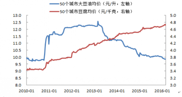 進口大豆和國內大豆價格均是從 2012 年底開始下跌, 但下游豆油和豆腐價格表現卻出現了明顯分化——豆油隨大豆下行,而豆腐卻一路上漲。這主要是由于豆油行業的工業化屬性更強,加工企業集中度高且覆蓋范圍廣;而豆腐則以小作坊為主,有明顯地域特征。這就造成大豆價格變化最終會傳導至豆油,而豆腐主要跟隨居民物價指數波動。