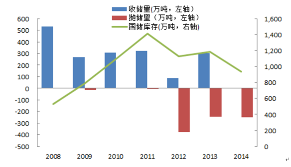 年份產量進口量出口量表觀消費量2011年1448552453208667302012年1305058383320711132013年1220063378209753692014年1235071404207835472012 年之前,政府基本不對外拋儲,令國儲庫存一度達到近 1500 萬噸的高位。為了緩解庫存壓力,同時清理陳糧,政府從2012 年起加大拋儲力度,但由于市場需求疲弱,拋儲也遇到很大困難,截止 2014年底,國儲庫存仍接近 1000 萬噸。