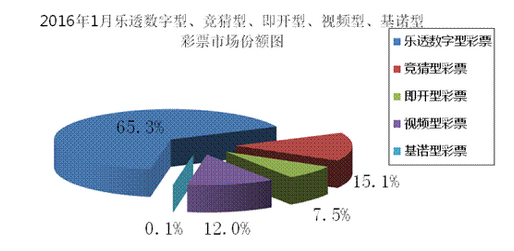 2016年1月份,樂透數字型彩票銷售213.07億元,同比減少31.17億元,下降12.8%;競猜型彩票銷售49.38億元,同比減少36.59億元,下降42.6%;即開型彩票銷售24.47億元,同比增加0.02億元,增長0.1%;視頻型彩票銷售39.26億元,同比增加2.20億元,增長5.9%;基諾型彩票[1]銷售0.23億元,同比減少0.38億元,下降61.6%。1月份,樂透數字型、競猜型、即開型、視頻型、基諾型彩票銷售量分別占彩票銷售總量的65.3%、15.1%、7.5%、12.0%、0.1%。