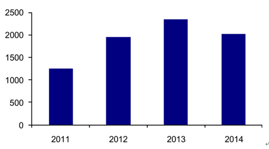 2011-2014年全球每年醫(yī)美次數(shù)統(tǒng)計(jì)(單位:萬(wàn)次)