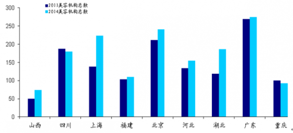 2011和 和 2014 年醫(yī)美機(jī)構(gòu)地區(qū)數(shù)量對(duì)比 (單位:家)