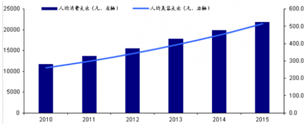 2010-2015年中國(guó)人均消費(fèi)支出和美容支出趨勢(shì)