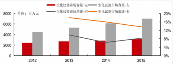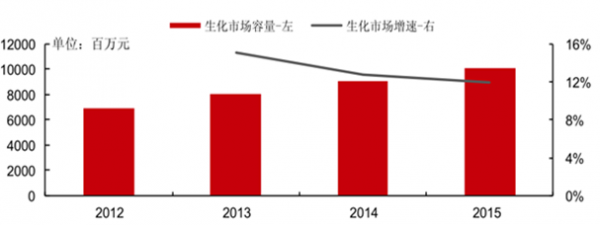 2012-2015年中國生化市場容量 及增速