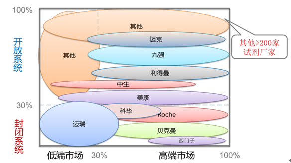 生化試劑作為耗材,被終端廣泛接受,尤其是和進口儀器搭配組成檢測系統,在國內尤為普遍,甚至大型三甲醫院也會采用這種方式。由于這種特殊的檢測系統,降低了進入門檻,各小廠家魚貫而入,紛紛來分一杯羹,加劇了國內的競爭。