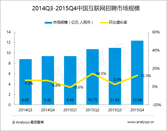 核心提示: 根據Analysys易觀智庫發布的《中國互聯網招聘市場季度監測報告2015年第4季度》數據顯示,2015年第4季度,中國互聯網招聘市場規模達12.38億元,環根據Analysys易觀智庫發布的《中國互聯網招聘市場季度監測報告2015年第4季度》數據顯示,2015年第4季度,中國互聯網招聘市場規模達12.38億元,環比增長12.3%。