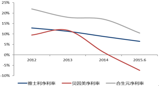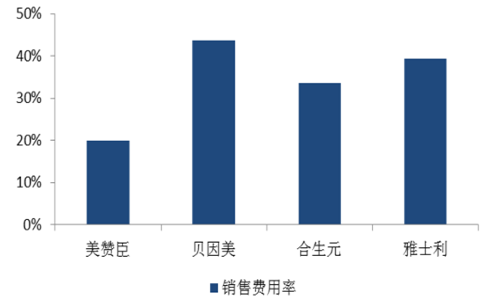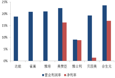 以美贊臣為例, 目前美國奶粉行業(yè) CR5 達到 85%, 美贊臣市占率 25%,其銷售費用率僅為 20%,而國內(nèi)奶粉企業(yè)貝因美、雅士利、合生元的銷售費用率分別達 44%、39%和 34%,遠(yuǎn)超過美贊臣。主要系國內(nèi)奶粉企業(yè)在激烈的市場競爭下,為了搶占更多的市場份額不得不加大打折促銷力度。盈利能力方面, 目前國外巨頭奶粉業(yè)務(wù)營業(yè)利潤率平均達到 20%左右, 達能 19%、雀巢 21%、雅培 21%、美贊臣 22%。除合生元利潤率達到國際水平外,其他國內(nèi)奶粉企業(yè)盈利能力并不強,雅士利的營業(yè)利潤率僅為 9%。