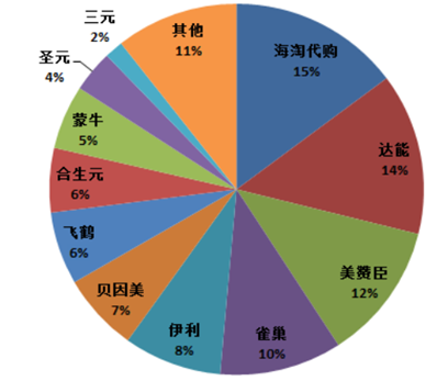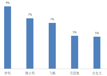 雅士利銷售收入有望達到 55 億,市場份額達到 7%,成為第二大本土奶粉企業(yè),僅落后伊利 2pct,飛鶴、貝因美、合生元分列國產(chǎn)奶粉品牌三四五位,國產(chǎn)奶粉前五大品牌市占率達到 33%。