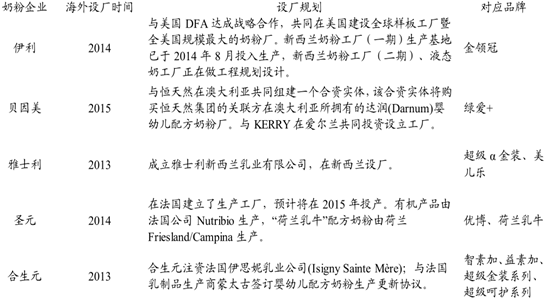 2013 年以來,伊利、貝因美等奶粉龍頭企業(yè)紛紛在海外設(shè)廠生產(chǎn)奶粉,一方面是由于三聚氰胺事件后消費者對海外奶源的安全性近乎偏執(zhí)地信任,在海外設(shè)廠可以緩解因三聚氰胺事件造成的奶粉滯銷狀況;另一方面是人民幣對原料國貨幣大幅貶值,海外設(shè)廠可以降低生產(chǎn)成本;此外中國政府大力推動人民幣國際化,海外設(shè)廠有利于擴大人民幣結(jié)算業(yè)務(wù)范圍,因此也得到了國家的大力支持。各大奶粉企業(yè)采取差異化品牌戰(zhàn)略,紛紛推出旗下原罐進口中高端品牌,與國產(chǎn)奶粉加以區(qū)分,強調(diào)“全程海外生產(chǎn)、原罐進口”的概念,銷售增速迅猛。以伊利“金領(lǐng)冠”為例,2014 年和 2015 年上半年,銷售額同比增速高達 91%和 33%。