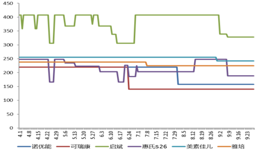 國行奶粉中,諾優(yōu)能 8 月初從 220 元降至 158 元,降幅 28%,低于 188 元海淘價;可瑞康 6 月底從 220 降價至 140,降幅 36%,低于 159 元海淘價;啟賦也從 408元降至 328,降幅 20%,低于 408 元海淘價。