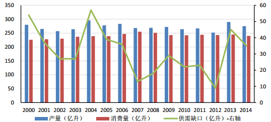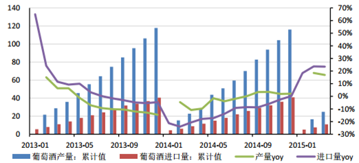 中國葡萄酒產量和進口量走勢圖