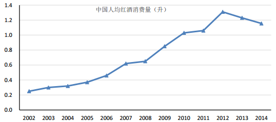 中國人均葡萄酒消費量走勢圖