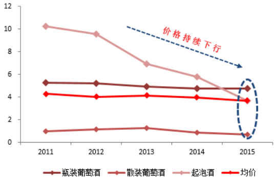 2015 年,智利散裝酒(低價)進口量占比達 72%,同比大增一倍左右,帶動散裝酒進口總量增長 78%,均價同比下降 20%。瓶裝酒進口量同比增長 38%,均價同比基本持平;但起泡酒進口量小幅下滑 6.6%,均價同比下滑 19.5%。全年來看,瓶裝酒價格下半年出現一定幅度反彈,但各品類進口酒均價延續 2014 年持續下行態勢,整體進口酒均價為 3.68 元/升,同比下滑 7.1%,預計 2016 年進口葡萄酒均價仍會保持下行趨勢。