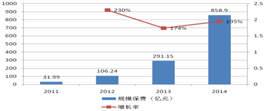 中國產業發展研究網( http://www.chyxx.com)發布的《2016-2022年中國互聯網保險行業市場調查及投資前景預測報告》中顯示:2011-2014年,互聯網保險的保費收入規模不斷擴大,增速均在170%以上。2014年,我國互聯網保險的保費收入規模為858.9億元,同比增速達195%,較上年上升21個百分點。2015年上半年我國通過互聯網渠道銷售的保險累計保費收入816億元,是上年同期的2.6倍,占行業總保費4.7%,這一收入已逼近2014年互聯網保險全年保費水平,對全行業保費增長的貢獻率達到14%。不可否認的是,隨著《互聯網保險業務監管暫行辦法》的下發,互聯網保險逐漸嶄露頭角,在所有互聯網金融的子行業中,成為最具發展前景的細分子行業。