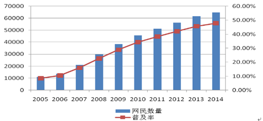 截至 2014 年 12 月,我國網民規模達 6.49 億,全年共計新增網民 3117 萬人。互聯網普及率為 47.9%,較 2013 年底提升了 2.1個百分點。 下圖是 2005-2015 年我國網民規模和互聯網普及率的增長趨勢。該圖顯示自 2005年以來無論是網民的絕對規模還是網絡普及率都呈現出數倍的增長;同時,網民的年齡結構呈現出向成熟人群擴散的特征,30歲社會中堅人群已經成為我國網民數量的主要增長點。