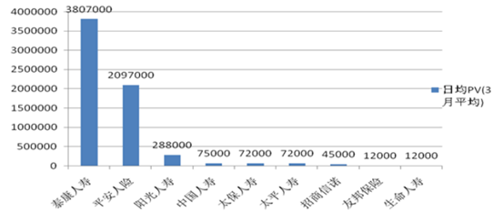 根據 Alexa 數據統計出相關互聯網保險公司日均 PV(三月平均)。根據統計數據可以看出,在人身險公司中,日均 PV(三月平均)排名前 3的公司分別為:泰康人壽,平安人險,陽光人壽,在前 10名公司日均 PV出現巨大分化: