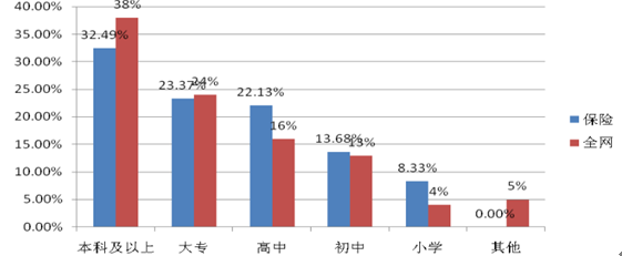 保險行業關注人群與全網網民的學歷分布對比