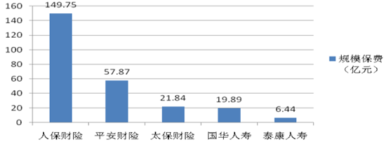 2013 年,在 60 家公司中,互聯網規模保費排名前 5 的公司分別是人保財險、平安財險、太保財險、國華人壽、泰康人壽,具體規模和排名見下圖,可見保費規模加速遞減: