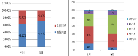 網民對保險行業的關注表現出群體差異性: 不同年齡段網民對保險行業顯示出不同的關注度, 其中關注度最高的 30-50歲網民, 占比為 58%, 高出全行業水平 18%;對保險的關注度也表現出性別分化。 如下圖所示,男性網民關注度明顯高于女性網民。