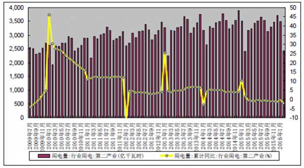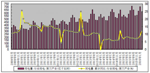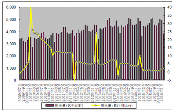 全國用電量2016年1-2月累計增長2.0%。第二產業用電量累計增幅-2.1%,第三產業用電量累計增幅11.9%。
