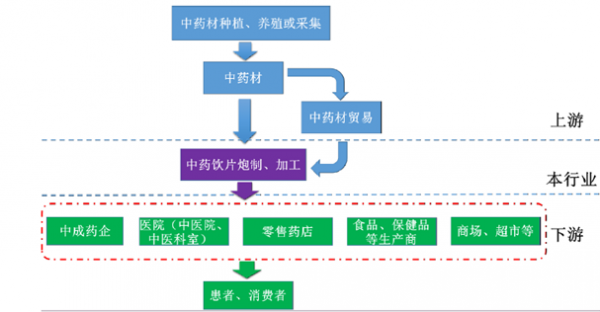 我國中藥產(chǎn)業(yè)鏈包括上游中藥材種植、養(yǎng)殖、采集,中游中藥飲片炮制、加工,下游中成藥企、中醫(yī)院、藥店等,中藥飲片處于產(chǎn)業(yè)鏈中承上啟下的關(guān)鍵環(huán)節(jié)。中藥飲片行業(yè)與上游中藥材種植、養(yǎng)殖行業(yè)關(guān)聯(lián)度較高,中藥材的資源儲備、產(chǎn)量、價格等變化,對中藥飲片行業(yè)相關(guān)品類產(chǎn)生直接和快速影響。如從2009年到2012年,由于云南連年干旱、需求擴大、游資囤貨等原因,四年間三七價格暴漲了10倍,2012年三七價格漲至500-600元/公斤,達20年來最高價。2013年7月,康美中國中藥材價格指數(shù)(三七)有記錄達到1099點,目前約181點,跌幅高達83.5%。中藥飲片的下游行業(yè)應用廣泛,主要包括中成藥廠、醫(yī)院(中醫(yī)院和中醫(yī)科室)和零售藥店,以及飲品、食品、保健品等制造企業(yè)。此外,中藥飲片還廣泛應用于保健品市場、藥膳、化妝品、藥用足浴等大健康、大中藥領(lǐng)域。部分藥食同源飲片直接進入商場超市或餐飲服務業(yè)。中藥飲片具有下游用途廣泛、應用行業(yè)多、終端消費渠道多等特點。