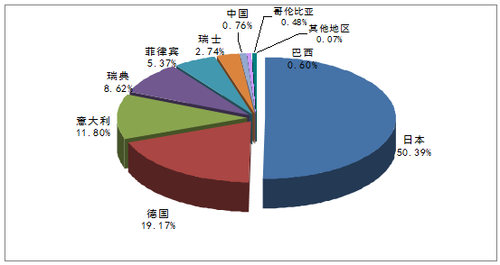 金額:美元數量:千克世界$5,555,51921,143日本$2,799,63112,539德國$1,065,1235,081意大利$655,710416瑞典$478,799153菲律賓$298,0911,836瑞士$152,355469中國$41,94539巴西$33,200492哥倫比亞$26,73341美國$3,30675其他地區$6262資料來源:中國海關