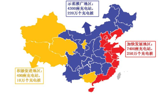 根據需求預測結果,按照適度超前原則明確充電基礎設施建設目標。到2020年,新增集中式充換電站超過1.2萬座,分散式充電樁超過480萬個,以滿足全國500萬輛電動汽車充電需求。針對出租車、環衛車、物流車、公務車和私家車的充電設施建設進行了詳細規劃,并將全國不同地區劃分為加快發展地區、示范推廣地區和積極促進地區。